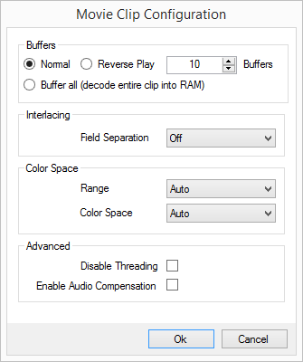 The properties in the category Audio can be used to adjust the audio playback of the movie clip and to select a playback device for the audio channel. Audio playback can be completely disabled with the Audio property and the volume can be adjusted with the Volume property. If the file has multiple audio streams, one can be selected with the Stream property in the Audio category.