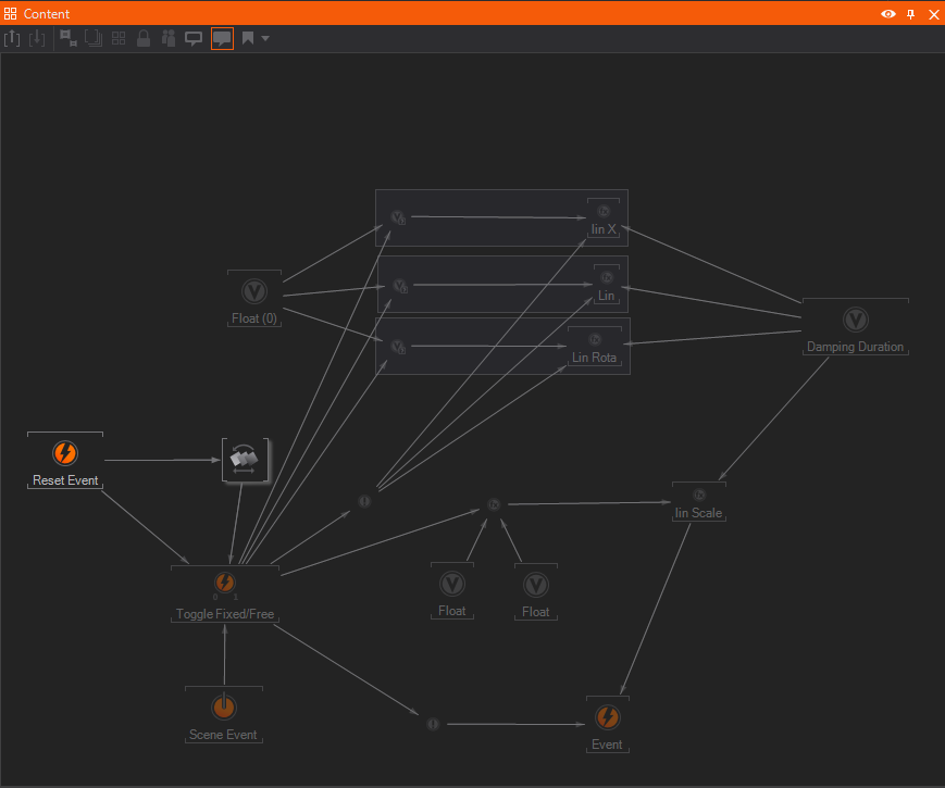 Bindings are visualized as arrows which connect nodes in the Content Editor. To create a binding, select a node, go to the Properties Editor and drag the input property onto another node. When released, Ventuz will open up a list of compatible output properties of that second node. Upon choosing one of the properties, a connection is created and visualized by an arrow going from the output node to the input node. For more information, see Property Editor.