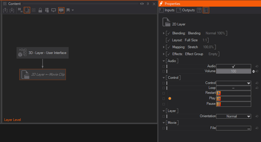 A content node describes an asset (i.e. a texture, an XML file, ...), a numeric constant, an event or any other item that does not directly influence the rendering process. In contrast, a hierarchy node is like an instruction to the Ventuz Rendering Engine, for example to activate a certain material or texture, to render a mesh and so forth. Layer Nodes are somewhat special in that they represent a 2D Compositing Layer - everything inside a Layer will be rendered onto a dedicated texture and then composited together with all other Layers using the Layer Effects and the Layer Blending and Masking.