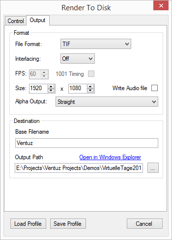 Ventuz supports two ways to create image sequences from any Ventuz scene. The first is a GUI-based Render-To-Disk functionality available in Ventuz Designer. Additionally, it is possible to create image sequences via a dedicated Remoting API.