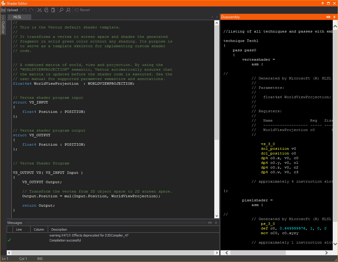 Ventuz supports customized shading of objects via the HLSL Shader Node and the Shader Editor is a dedicated editor for this node. This document discusses the user interface of the editor, for details on developing shader code see here.