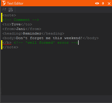 When editing XML data (see [NodeDataXML XML Text node]), the editor features syntax highlighting capabilities. In addition, it checks the content for being well-formed (e.g. a closing tag exists for each open tag, a tag is only closed when all its child tags are closed, ...). It however does not perform any validation against a DTD file which may or may not be specified in the content.