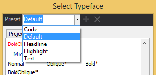 The Typeface Editor manages all fonts and font presets in a project. The editor consists of two font browsers, one for Project fonts and one for System fonts. The latter are fonts which are installed on the local machine. The browser lists all fonts alphabetically. Default/Standard fonts which are present on every new Windows 7 installation are displayed in black. All other fonts are marked red.