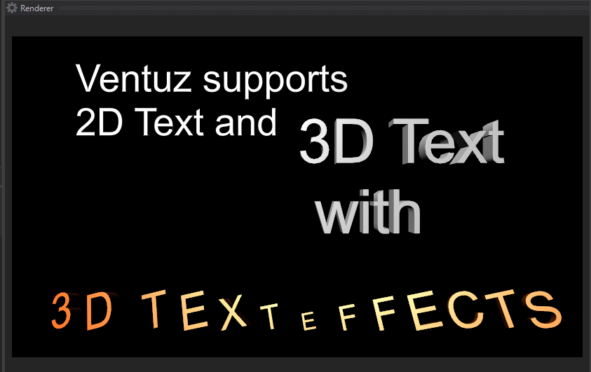 Ventuz provides a wide range of text effects and rendering styles. The modular structure of Ventuz offers the possibility to combine different effects and styles, resulting in virtually countless possibilities of displaying and animating text. The following sections shows the Project-specific font handling. The description of the text-related nodes can be found in the Nodes section.