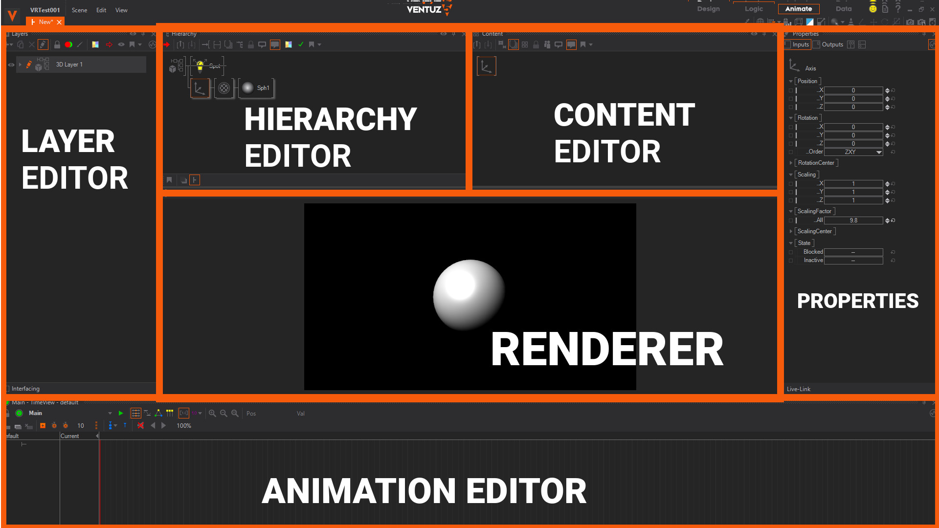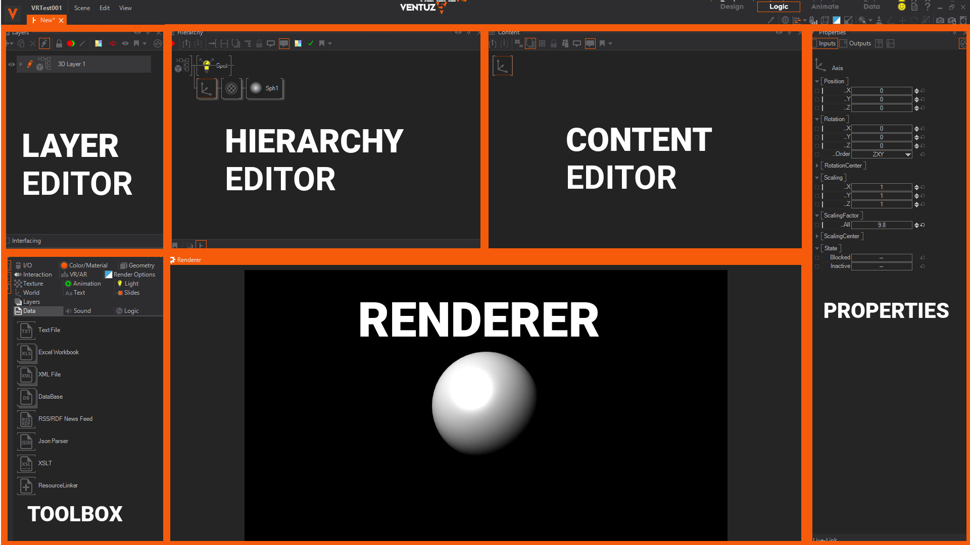 This Layout is made for all the tasks that involve creating complex logic and 3D scenes. It is the closest to previous versions of Ventuz, and apart from the Renderer, it features the Layer Editor, Hierarchy Editor and Content Editor, together with the [Toolbox Toolbox] with the available nodes and the Property Editor to adjust the available parameters.