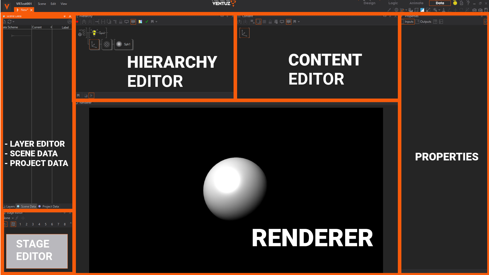 The Data Layout is made to give you quick access to Data related Windows like the Scene Data Editor, Project Data Editor and the Stage Editor. It still has the Hierarchy- and Content- Editor.