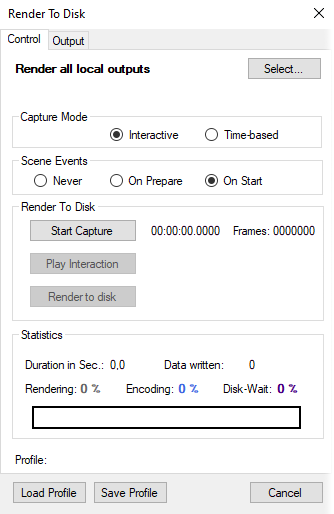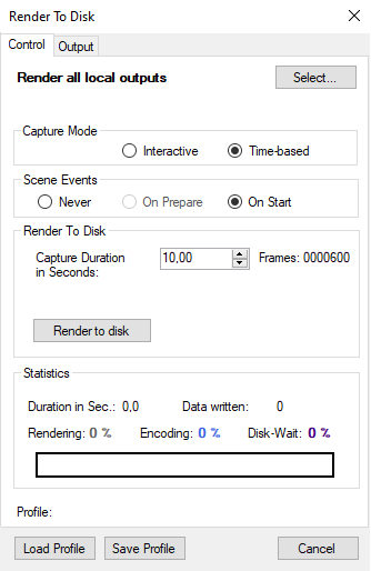 In Interactive mode, the Render To Disk section provides controls to start and stop the recording steps. If user interaction has been recorded, it can be played back by triggering the Play Interaction button. The actual playout to disk is started by pressing the Render to disk button. Note that both buttons are disabled if no recorded data is available. The interaction recording is divided into two phases: in the first phase (preparation) the user can record, reset and initialize inputs; in the second phase, the inputs for the actual playout are recorded. In the time-based mode, only a capture duration can be specified which defines the number of frames to capture.