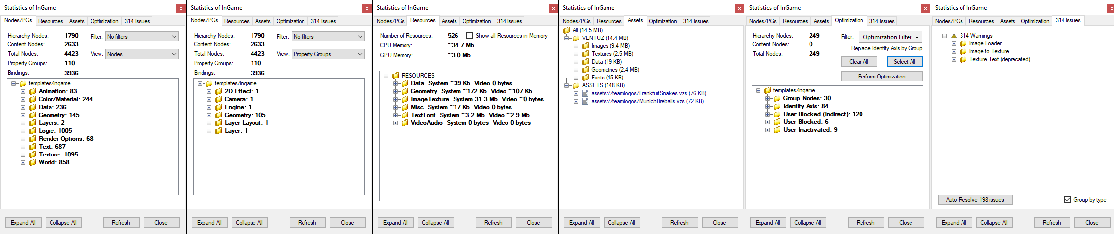The Resources tab shows the memory usage of all scene resources. If the Show all Resources in Memory option is enabled, all resources of all loaded scenes will be listed; otherwise only those of the active scene. The resources are assigned to different categories/folders: