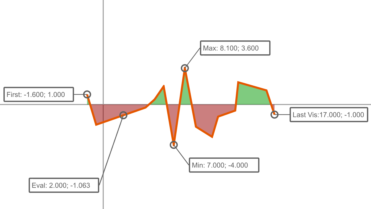 It is also important to understand that the SizeX property behaves differently in case of XY value pairs. If the input array contains only Y values, they are distributed evenly in an X range from 0 to 1. SizeX then just scales the resulting geometry but the underlying math just operates in 0 <= X <= 1; This becomes obvious by the LastValueX value which in this case always stays 1. If the input array provides XY values pairs then of course the X values come from the input array and are not limited to a certain range. In this case the SizeX property acts as a maximal geometry extend in positive and negative X direction. This means that e.g. in case of SizeX = 20 the chart geometry will never exceed the X position [-20, 20], even though the input X components can be larger. The resulting geometry is just scaled down in X to fit inside this limit. This distinction between Y only and XY value pairs is also important when it comes to the EvaluationX input property. The Chart nodes calculate the corresponding Y values (Evaluation output properties) for an input X. In case of Y only inputs the EvaluationX is only valid in the range [0, 1]; in case of XY value pairs the valid X range is not limited. The evaluated value is always the incoming X value of the value pair. So if the geometry is scaled down with the SizeX property, the evaluation is still done with the incoming X value and not the Position X value!