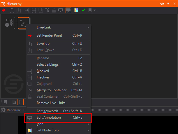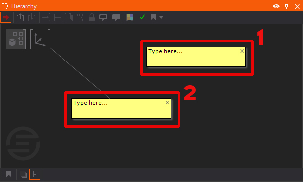 To edit a Annotation double click the created yellow text box. Annotations can be used differently depending on where you put them. In the Hierarchy Editor for example it is possible to have Annotations not only attached to nodes but also have them floating freely on the position you choose. To add a Annotation click here: