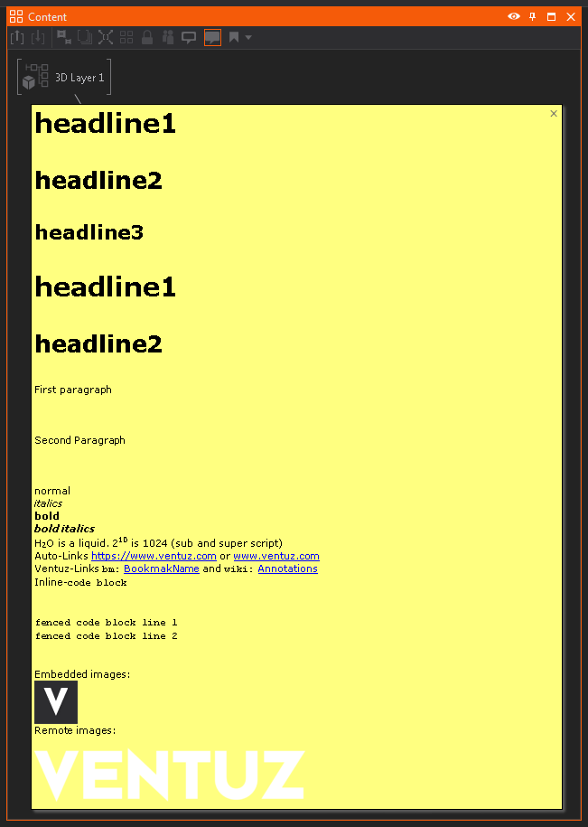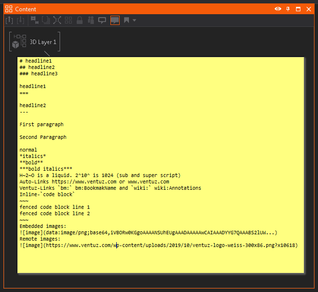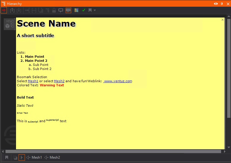 Annotations are a great way to document your scene, you can leave notes either attached to Ventuz nodes, a Ventuz Layer, a Property or put them directly into the Hierarchy Editor. It is also possible to link to certain bookmarks, websites and so on.