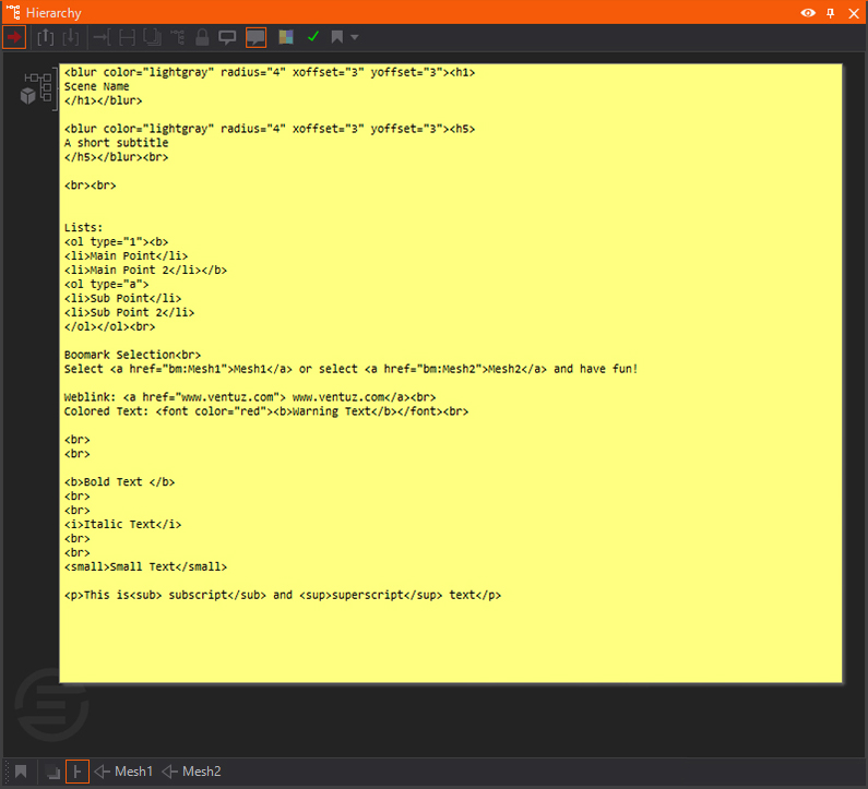 In the Content Editor those can only be attached to nodes. The text inside the Annotations is HTML based which means you can use a certain syntax with some tags we enabled. This enables things like color changes of the text or linking to certain points in the scene via bookmarks as well as many other things which you will learn in the following part.