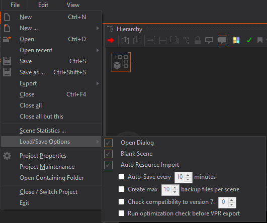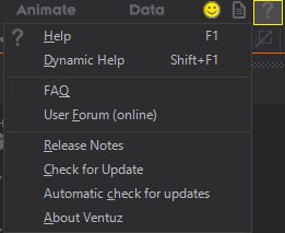 Under Help you can enable/disable the Dynamic Help, check the latest Release Notes or enable/disable the Automatic update check for Ventuz via internet.