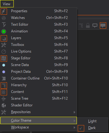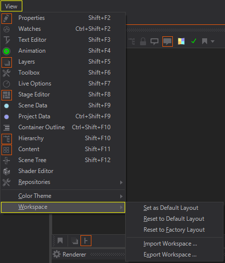 The Ventuz Designer allows some user-dependent configurations that are described above. Look for the eye symbol inside the certain editors to find the options menu.