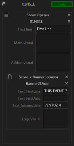 Depending on how the cued content was created, there can be further icons to the left of a template name. In the example below, the part below "Show Opener" has been created based on a Playlist Entry (four vertical lines) and the part "Score + BannerSponsor" based on a Sub-Page. To make it easier to spot which parts belong to which, a box is drawn around the respective areas.
