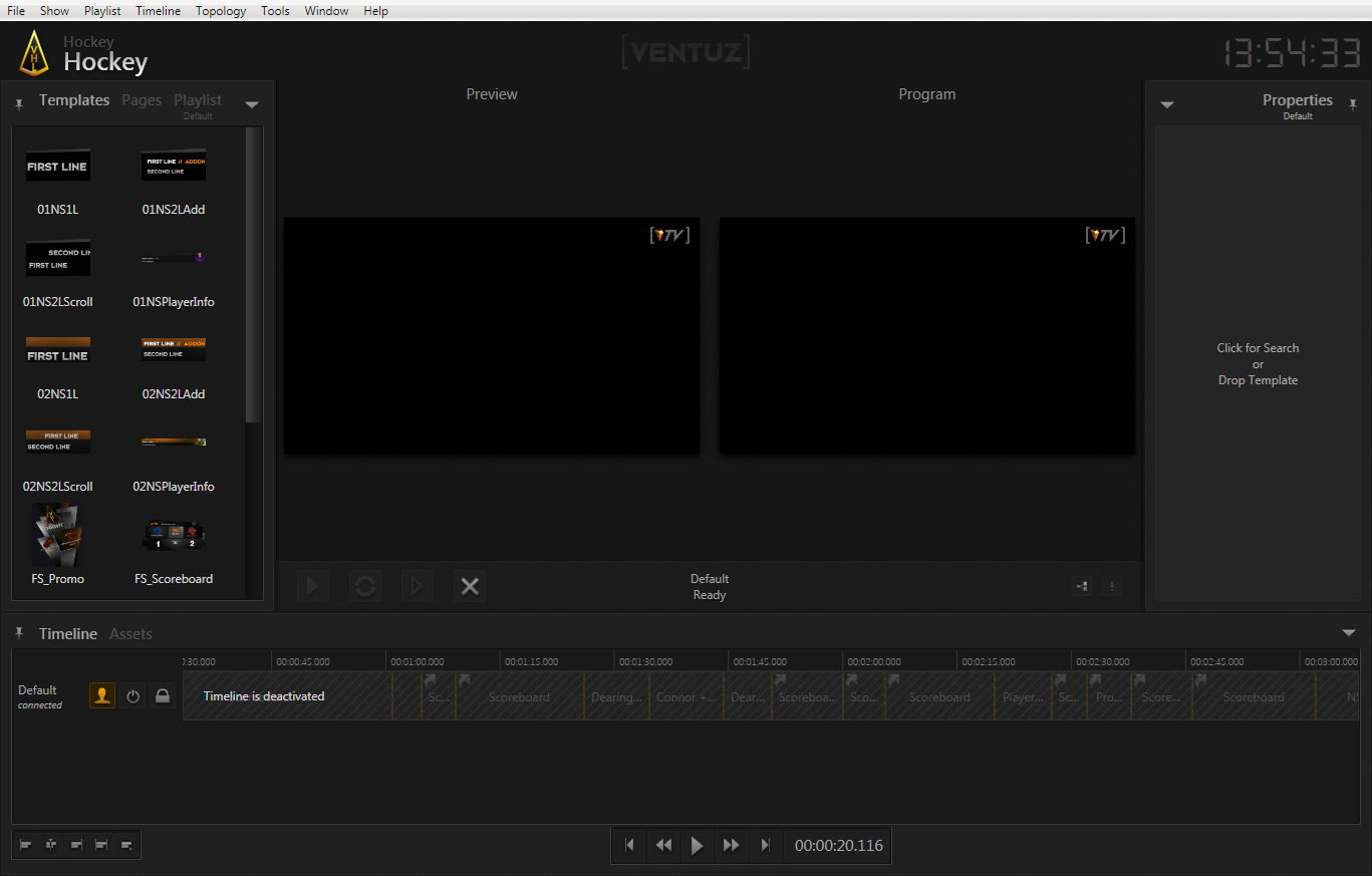 To get content on air, one first picks a template and puts it into the cue. Move the mouse to the docking window on the left labeled Templates and double- the 01NS1L thumbnail in the top left corner. Three things will happen: