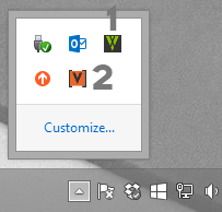 As soon as a show is opened, a few things will happen in the background. Director will connect to the Ventuz Machine Service (VMS) that has been installed as part of the Ventuz installation process. You can find it on the right side of the Windows Start bar at the bottom of the screen (where for example the Windows volume control is as well). As a typical Windows machine has a number of services running, one usually has to click on the small triangle to reveal all other services to see the small "V" icon of the VMS. The V is green if everything is okay or red if there was an error. Hover over the icon to get more information about the VMS's status.