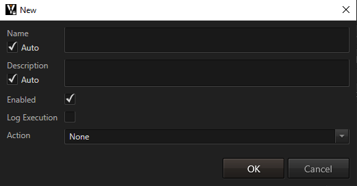 In the upcoming window you can define the Name and Description of the macro. By default these will be generated automatically based on the macro's effect. Enabled let's you temporarily disable a macro without having to delete it. If Log Execution is active the Ventuz Director will create a log message on execution with its Name, a unique identifier and all given parameters.