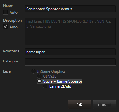 A dialog appears where a name, description and other properties of the page can be edited. Name and description can be created automatically from the entered templates data items. Which data items are used is defined in Ventuz Designer during the creating of the template. A checkbox allows to switch between automatic creation and manual input.