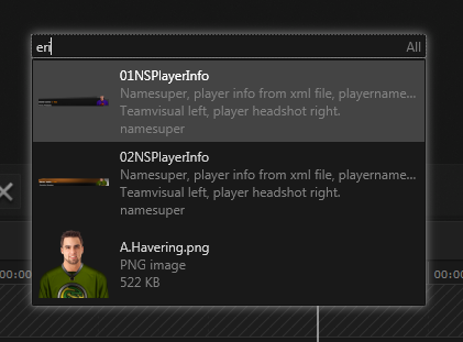 The answer to this is the Shot Box, a quick way to access all available templates, pages and assets. To open it, an operator can press + on the number pad regardless of what he is currently doing. A small text box will appear in the center of the application. Upon typing, the shotbox filters through the show's content and presents the first ten matches that contain the search string in their name. In the image below, the search string "eri" has been entered which yielded three matches: