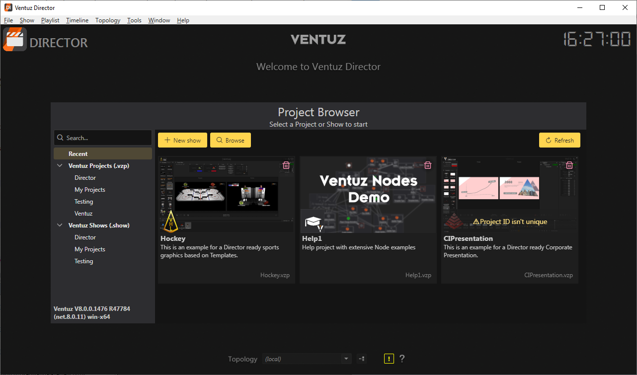 When launching Director or closing the active show, the Project Browser is shown inside the Director's work area instead of the usual docking environment. In the center, the last opened shows are shown. Above are buttons to quickly create a new show, browse for an existing one or refresh the browser.