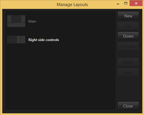 Since layouts are so powerful, Ventuz not only allows for adding and removing windows but also for switching between different layouts. Window layouts are managed via the main menu Window/Window Layout/Manage.... The list shows a thumbnail for each available layout as well as its name. double-click on the name to edit it. By selecting an entry, the buttons for re-ordering, deleting and resetting to default become enabled. To actually activate a layout and use, press the Activate button.