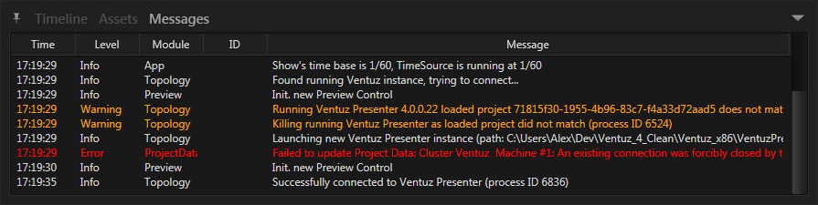 In the lower right corner of the launch screen is the message icon which also can be found in the same corner when a show is open. Whenever an error occurs, the icon flashes red. By clicking on it, the messages window is opened or closed again.