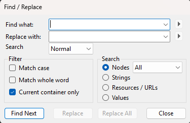 It is possible to perform several Search and Replace operations in Ventuz Designer. As with nearly every Windows application CTRL + F brings up the following Find / Replace dialog: