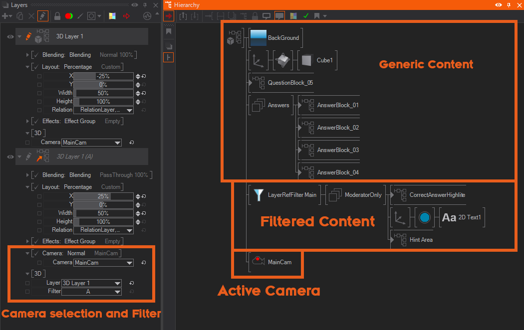 In the screenshot below we have marked the Area as Generic Content, this content is visible for both: the Game Show Master and the Guest. The Content in the Filtered Content Area is ONLY visible to the Game Show Master since it has the LayerRefFilter node in front and is set to be only visible in Main.