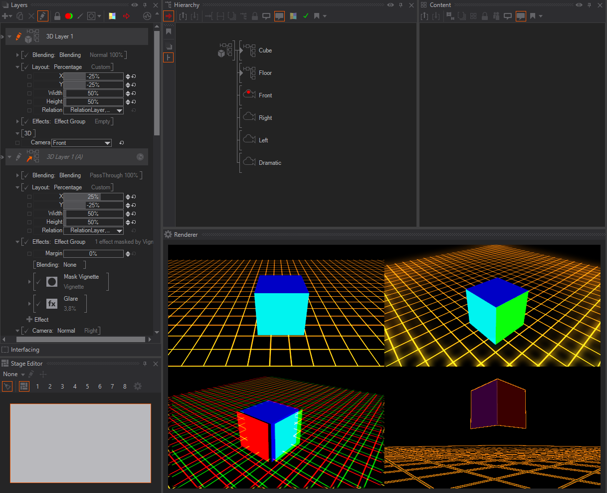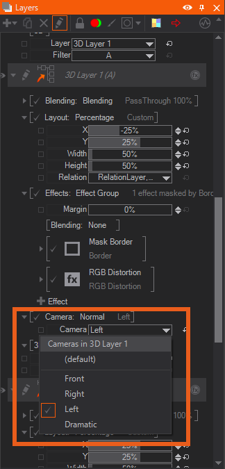 You should also use the Layout to align all the different layers on the screen. In our example, we are using the Percentage and split our screen into four sections by changing the Width and Height to 50% and reposition each view by using the X/Y. Main / 3D Layer 1 is the top left, Right in the upper right, Left to the bottom left and the Dramatic is assigned to the lower right section of our screen.