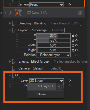 Furthermore we also want to use the original MainCam from the 3D Layer 1. Use the Camera drop-down menu and switch from (default) to Normal. Now select the Camera, in this case, the renamed MainCam from the Camera drop-down menu.