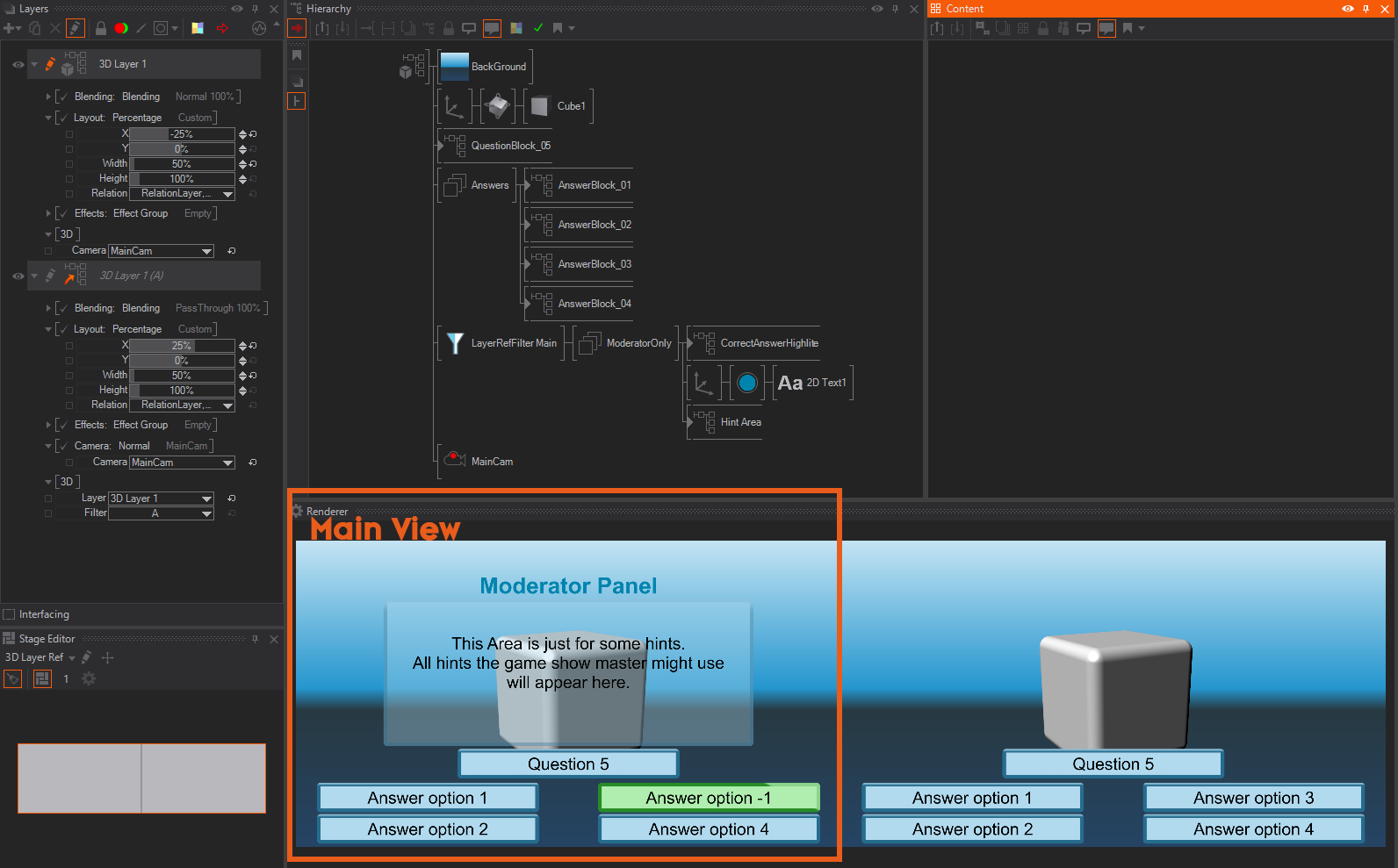 Let's assume you have already created the layout for your Game Show and the Question - and Answer fields are in their position. Additionally, you have created a panel for the Game Show Master which can contain hints for the Guest. The render setup has been configured for two screens, one for the Game Show Master (Main) and one for the Guest.