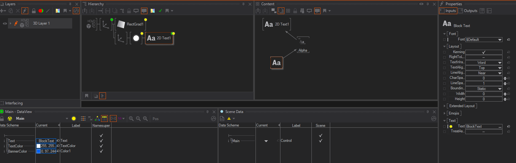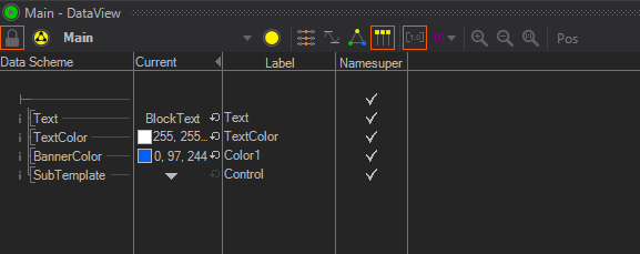 To make this Template more useful, some Data should be made accessible to the Operator who uses it in the Director. In this case it makes sense to give access to the text and the color. To make a property accessible, go to the Data View of the animation. Now go to your node, click and hold the desired property from the Properties Editor and drag it to the Data View. release when the label turns green. Properties connected to the Data View, and the nodes the properties belong to, get an indicator in the form of a yellow dot.