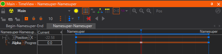 Since a Template is strongly connected to animation, as can be read here, and we would like our name super to be animated when take it on air and off air, we switch to the Animation Workspace and animate the Scale X Property of the Axis in front of the Rectangle. To let the name super scale in from the left. For the text, for example add an AlphaEffect and drag the Progress Property to the animation. Add three states and give it a nice animation as you would in any other Ventuz scene.