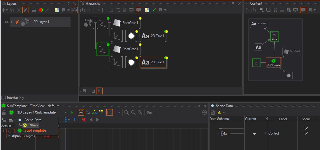 We now have a simple Template which can be loaded in the Director. To give it a first try inside the Designer, go to the Main Animation, click on the yellow template button and switch through the states or simply test your template on the Scene tab. If you want to use a Keyframe-Animation node, instead of the main animation channel, you need to bind the control value of the Animation node manually to the scene data, to turn the animation into a template, controlled by the Director.