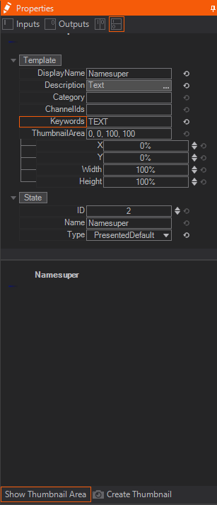 At the top of the Scene Data View, a yellow triangle can be seen. click brings up the message that there are Thumbnails missing. Creating a Thumbnail for a Present State is a nice feature, since it will be shown in the Director and makes identifying the Template easier. To create a Thumbnail, click on a Present State in Logic View of the animation. At the bottom of the Properties Editor two buttons for creating a Thumbnail can be found. By default the whole screen is selected for the Thumbnail, to change it click on the Thumbnail Area Property.