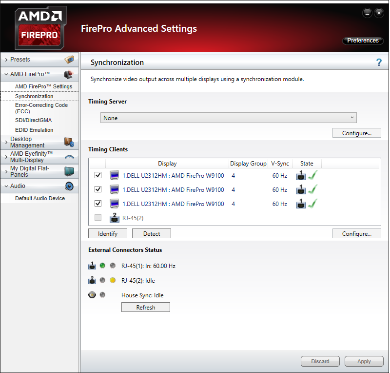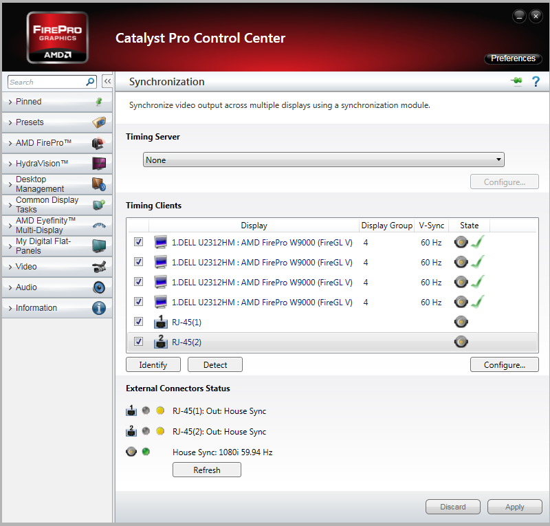 Next, configure the timing master and client in the graphics card driver. See the graphics card manual for details. Below is an example screenshot for a four display machine set up as timing master. Configured in AMD Catalyst Control Center. The timing signal comes from an external sync generator.