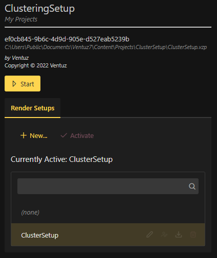 After the physical outputs have been configured, inside of the graphic card's software. Click on the Presentation File (VPR) that was uploaded in the first step of this section. In the panel on the right, click + New.... Choose a name and click OK. In this example, "ClusterSetup" is used. Clicking OK will automatically open the Render Setup Editor.