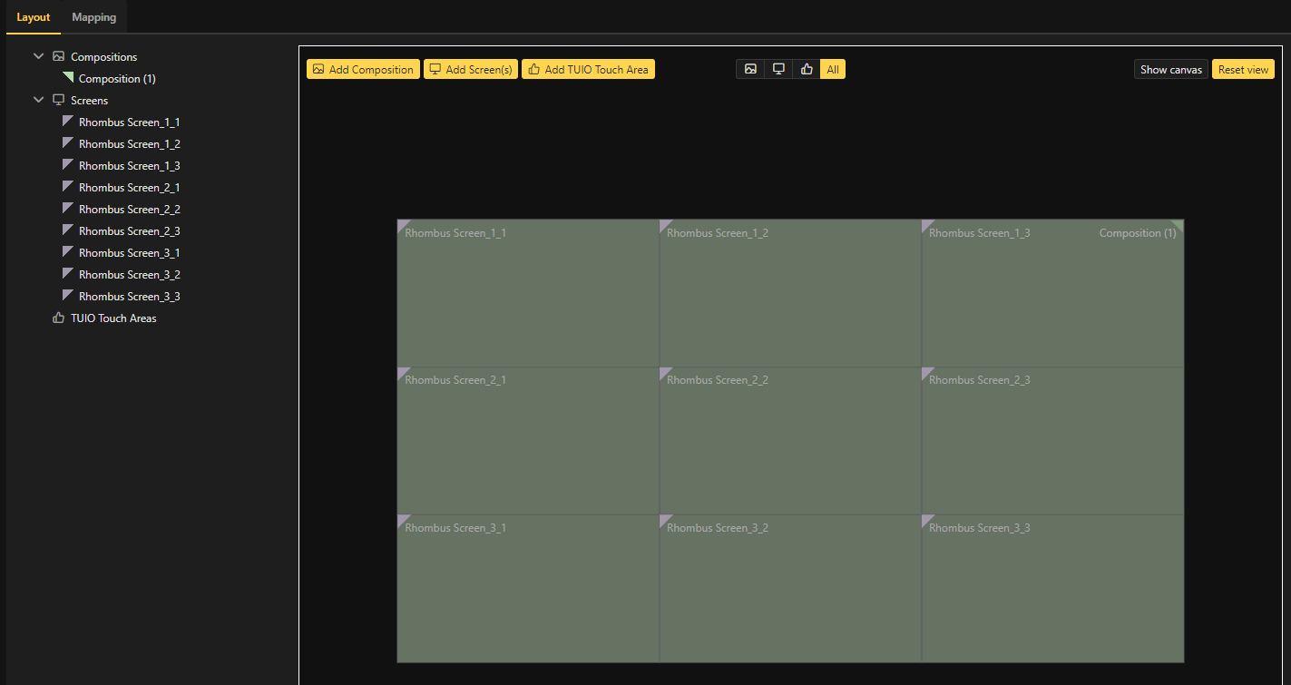 click on Add Screen(s), choose a name for the setup, in this case Rhombus Screen is used. Leave the resolution and advanced settings as default. In the Grid section of this pop-up, change the value from 1 x 1 to 3 x 3; This will create 9 screens in a grid.