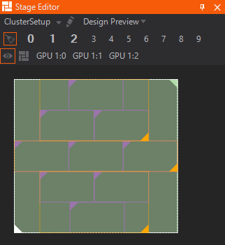 The last two modes are useful for checking whether or not a scene is well prepared for multi-machine, or cluster, rendering. The rendering mode can be changed in the Stage Editor by clicking on the display arrangement preview at the bottom of the Stage Editor. Click on a single highlighted machine or the border of the whole cluster to switch between Machine and Cluster Preview.
