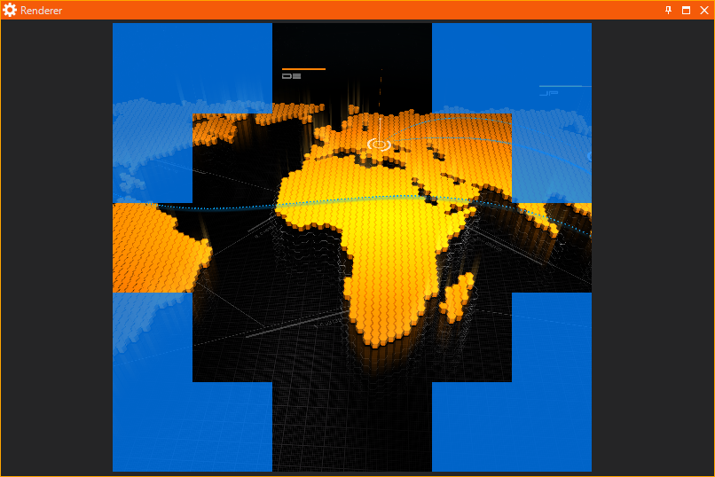 The way this new configuration will appear inside of the Renderer window in Ventuz Designer will appear as below. Ventuz renders rectangular areas and automatically applies a mask in the preview modes (Cluster and Machine Preview) to mark the rendered areas. The areas not masked represent the final rendered content in Production Mode when running in Ventuz Runtime.