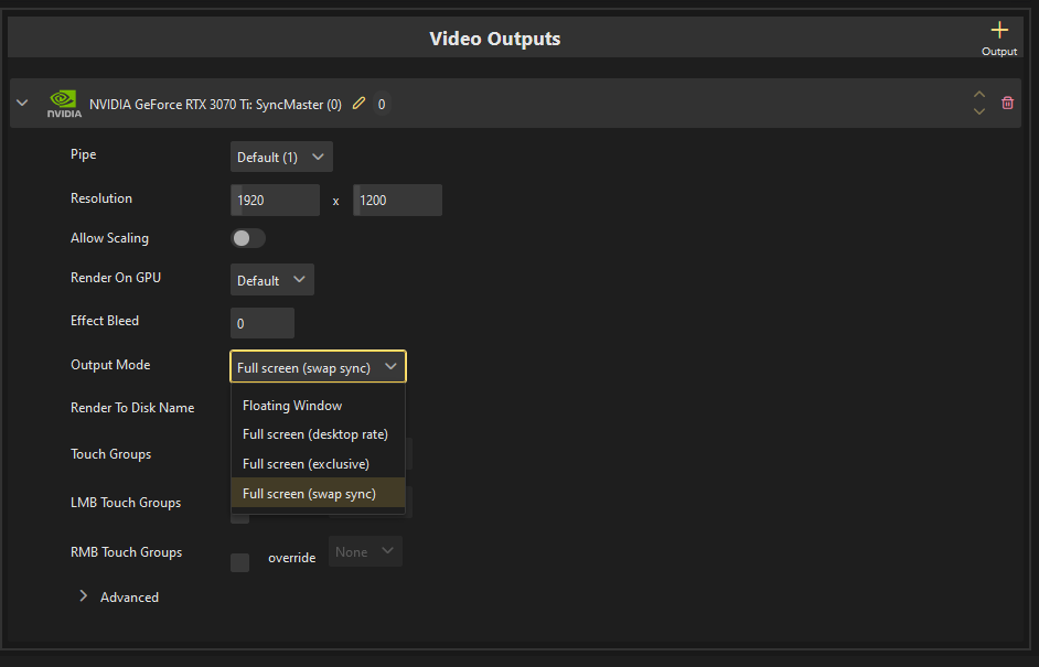 Now that the displays' refresh rates are set to a common time source, internal or external, tearing or flickering should be prevented. This was done in the graphics card configuration. As described above, Swap Sync requires support by the application - Ventuz in this case. To enable swap sync, move to the DirectX Output of the Device Configuration.
