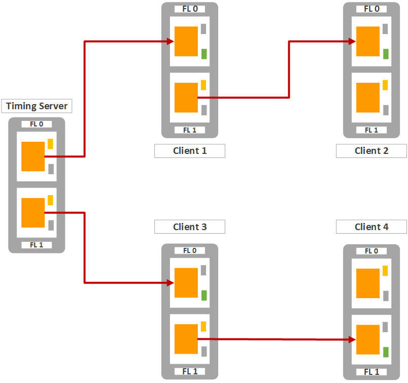 The machine that acts as the timing server uses both of its RJ-45 as outputs to distribute the timing signal. A client uses one as input and the other one as output, so the signal can be passed to another client. It is recommended to split the clients in two equal groups and arrange each group as a daisy chain connected to one of the two timing server outputs.