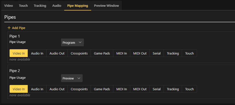 Open up the configuration editor and create a new Device configuration. In there we will first go over to the Pipe Mapping and add two pipes. Assign the first to Program and the second to Preview like shown in the picture.