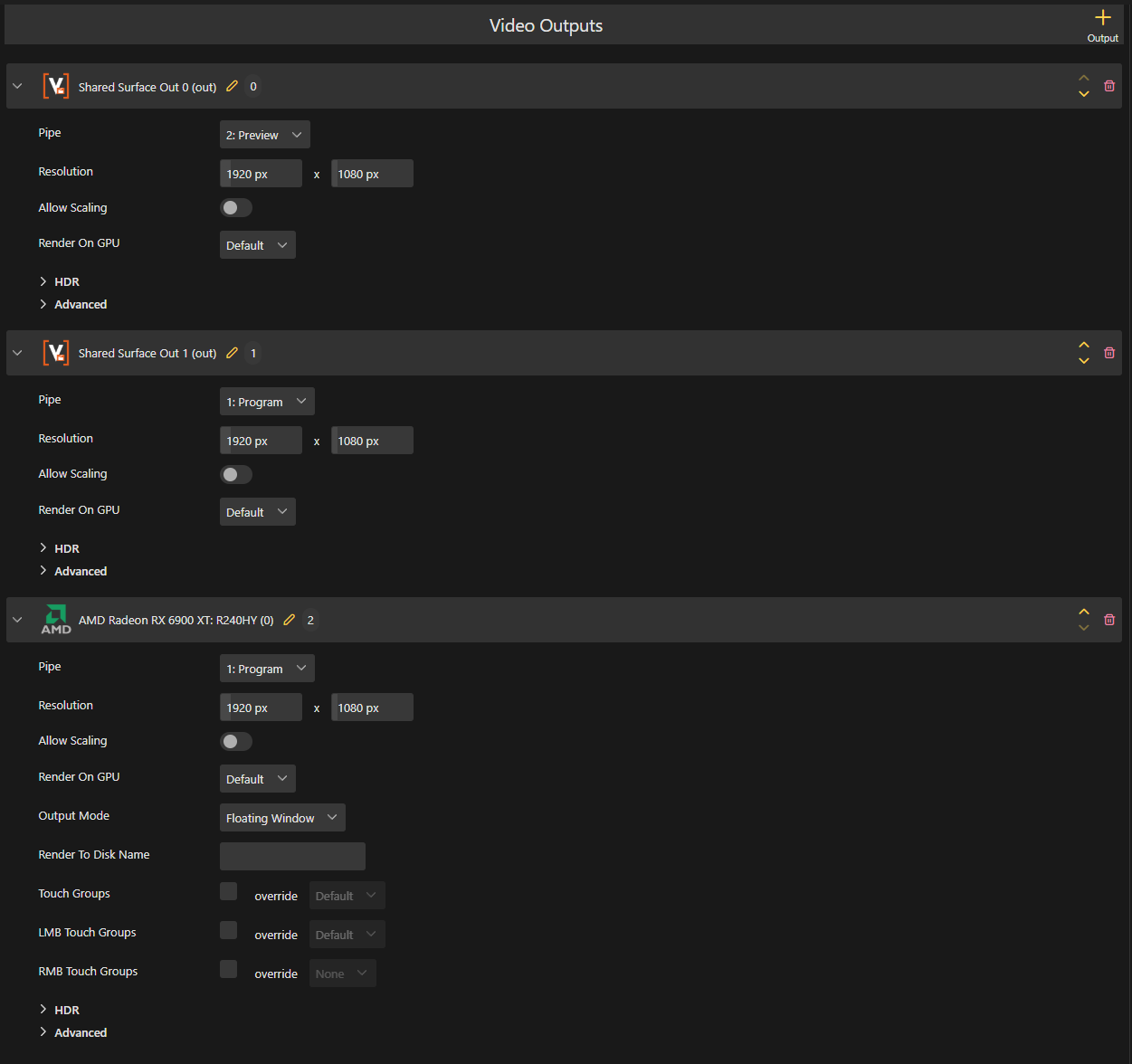 Now we can add our video outputs. Add two shared surfaces, called off screen. And one GPU output. Make sure to open these up and assign the output pipes as shown below.