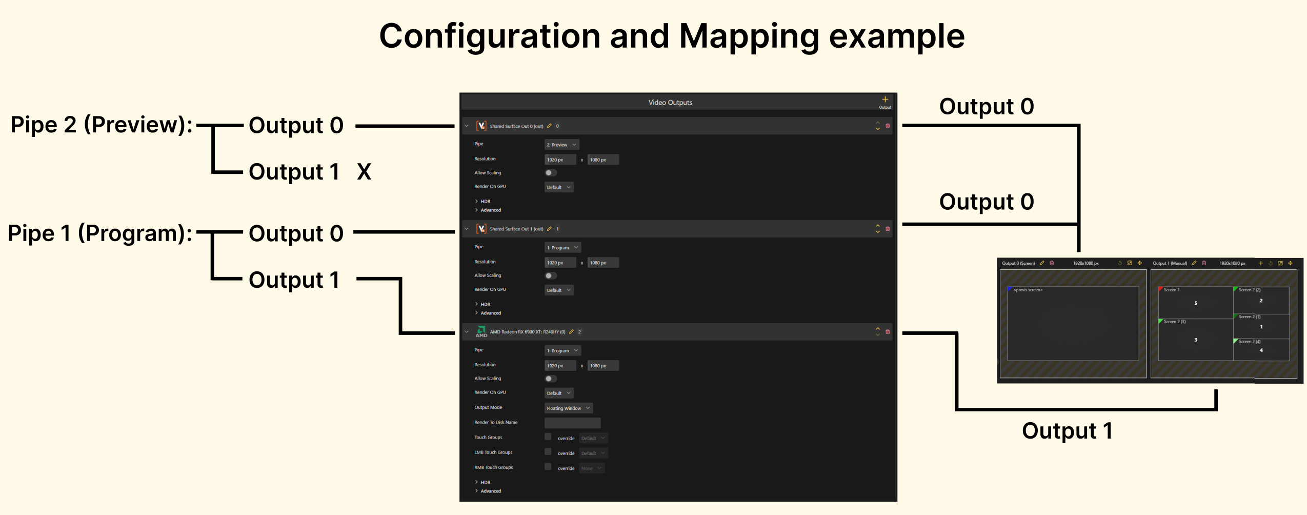 As you can see on the left every pipe will try to use two outputs if possible, thats why the position was so important. Any other other position would result in one output ending on a different pipe. The Mapping in the Render Setup also has to match the position in the Device configuration otherwise this would again produce a wrong result.