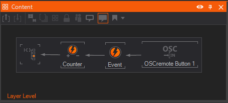 We could now bind the Counter's Forward property to the OSC Input Node's message event but that event is also triggered when the button is released. Instead, add an Event Node and bind it's Shot property to the OSC Input Node's buttonstate output. The Event node will automatically reinterpret the int value such that the event fires whenever the input value changes to non-zero.