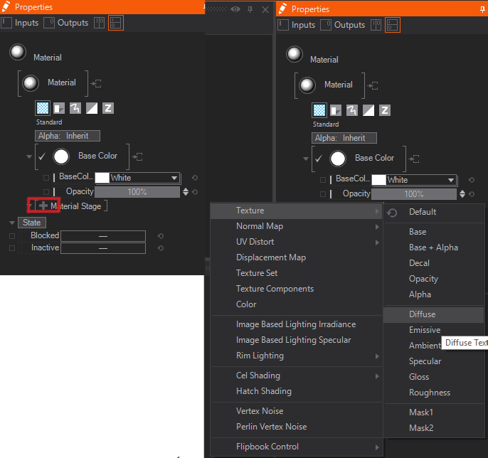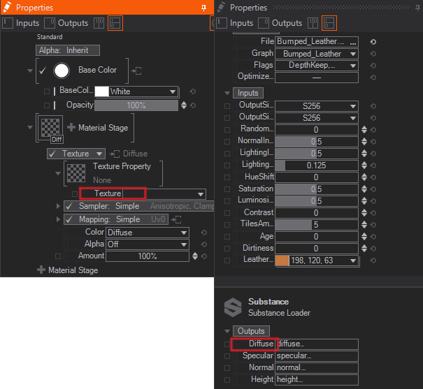 The Substance Material node works similar to the Material node, but it will create Material Stages and Lighting Options based on the loaded Substance. Thus you do not need to care much about the exact usage of the different textures. Though, in order to adjust the Substance Material's properties you will need to familiarize yourself with the Material node first.