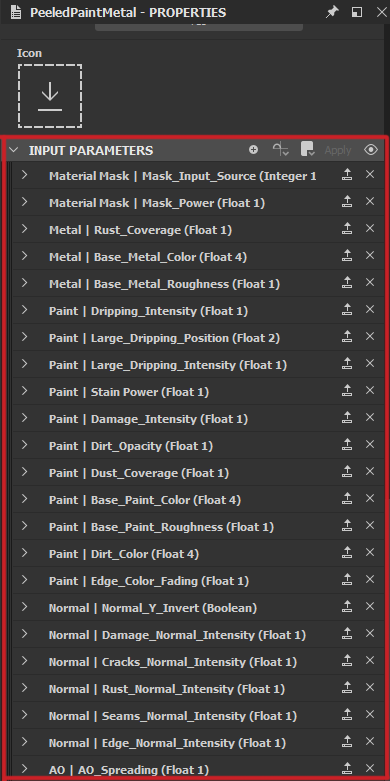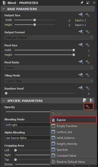 After you are done with creating your Substance Graphs you have to decide which input parameters are important to tweak later e.g.: Blending mode, height intensity, X and Y amount etc. If you want to be able to do so in Ventuz you need to Expose them in Substance Designer. To do so  click the desired function on the parameter tab and hit Expose: