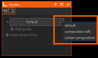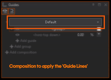 To create Guide Lines, click the + Add composition get started. Per default the Default composition will be used. If multiple compositions exist and you want to assign a different composition, click open the drop down menu and select the desired composition: